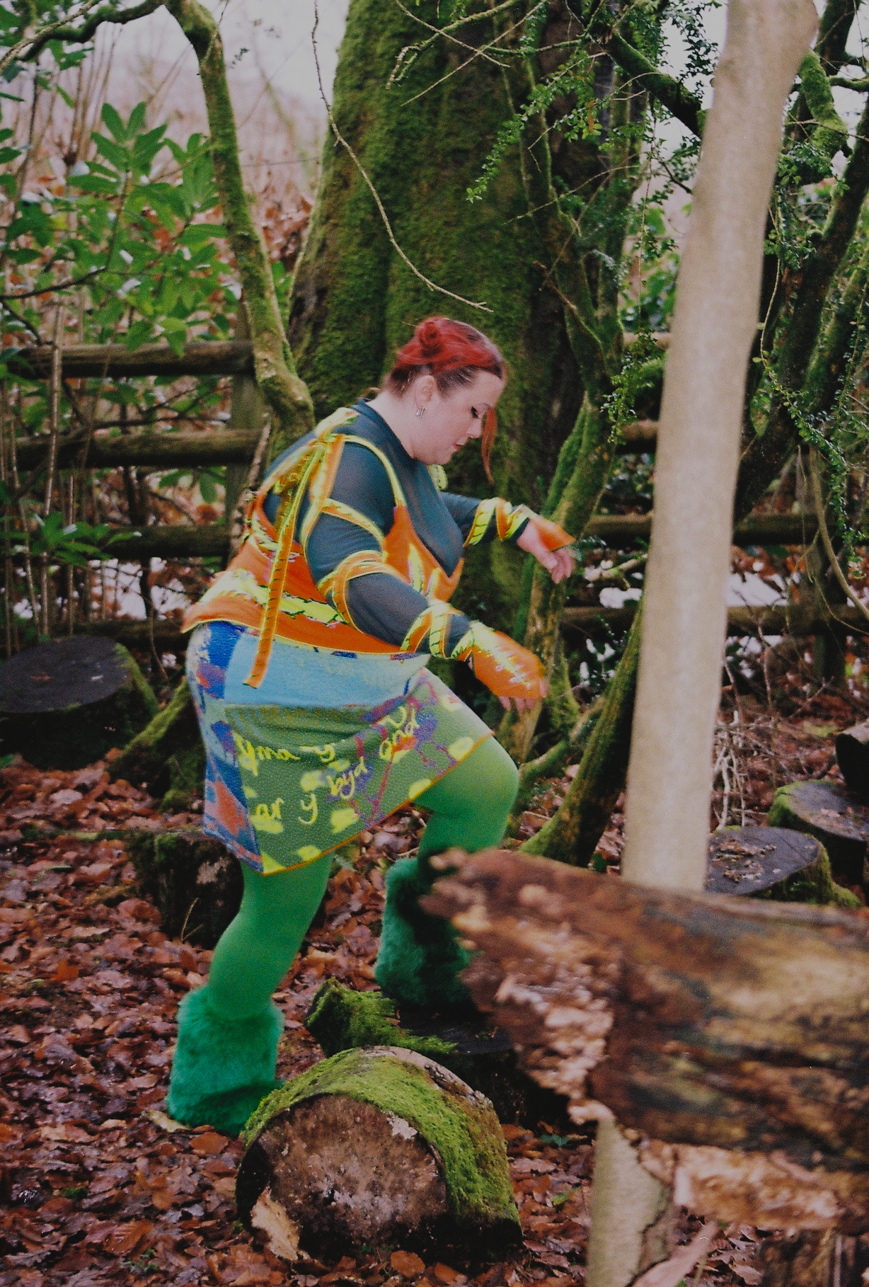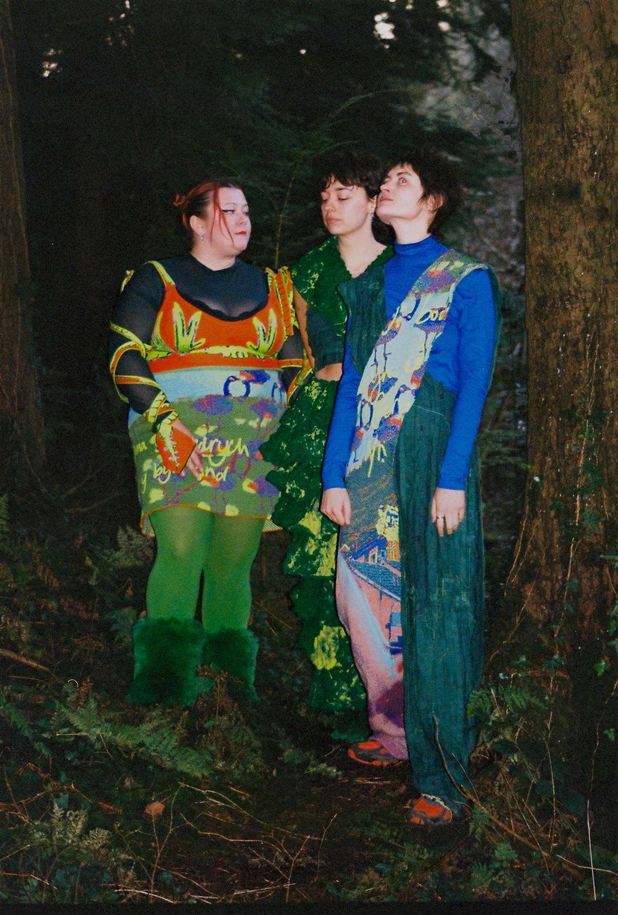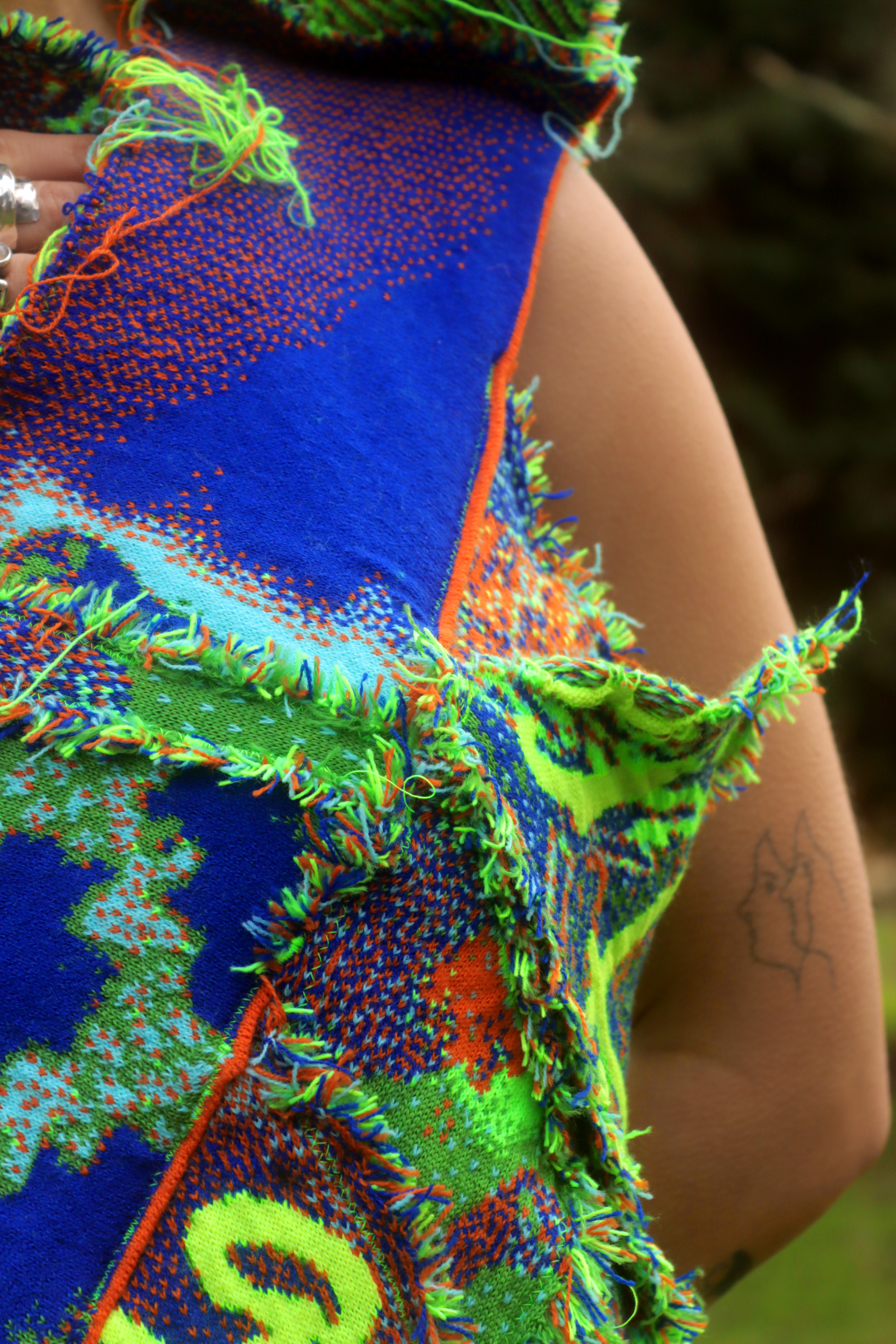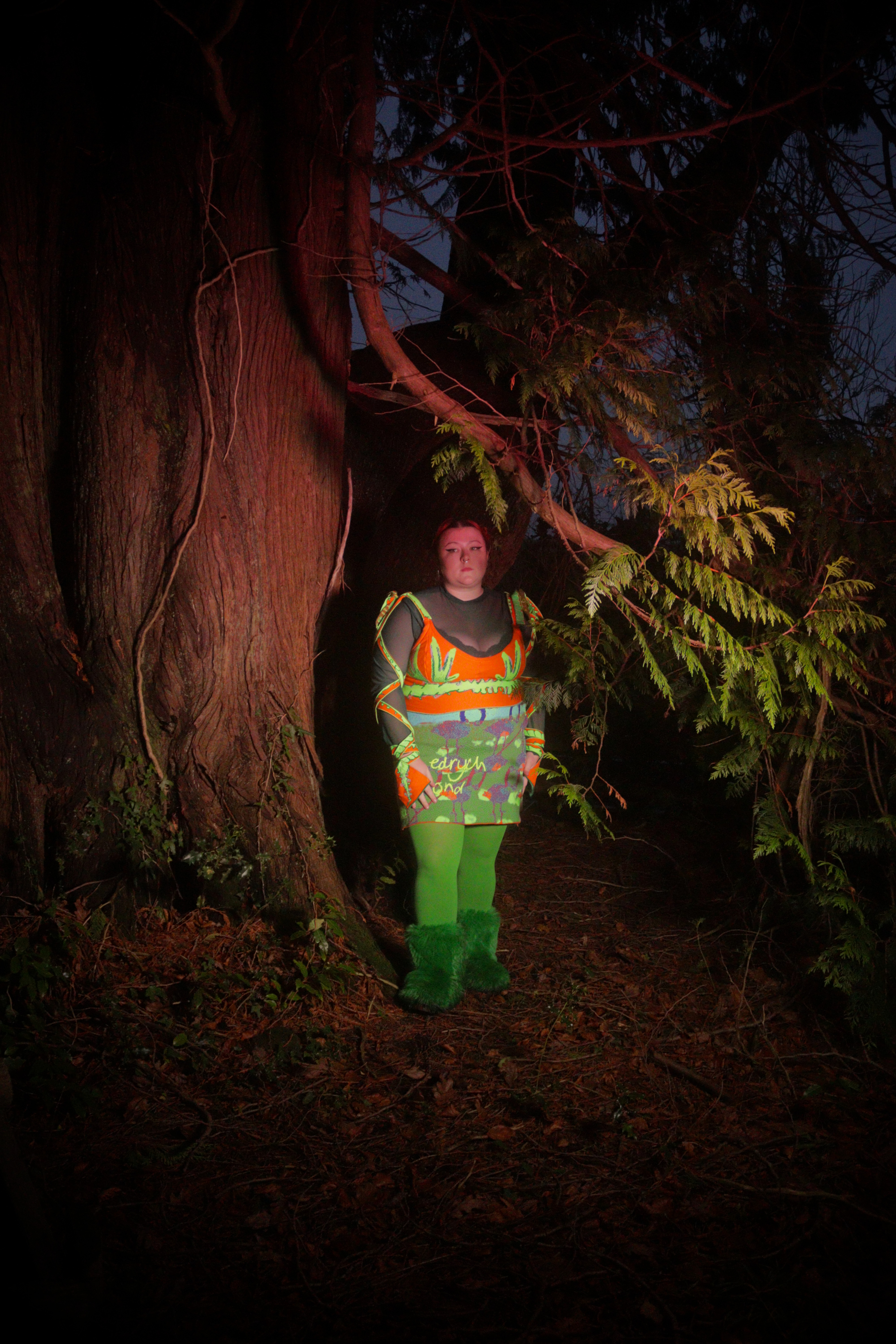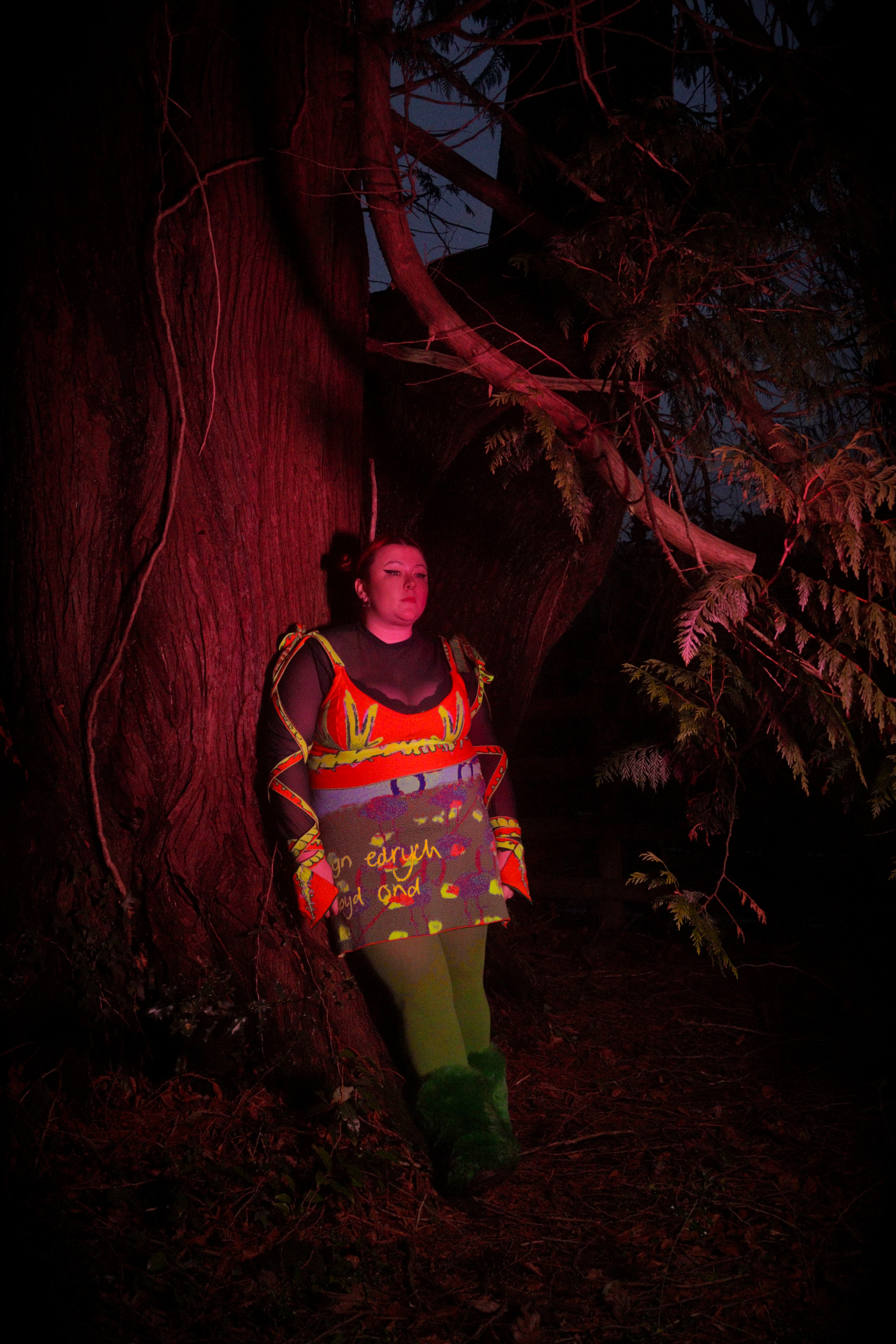 Hollie, the lead singer from Adwaith wears a custom ensemble. This digitally knitted dragon bra details illustrations of the Welsh flag. Complete with Welsh love spoon sleeves and dragon tail gloves. Hollie’s skirt is formed from a digital knit comprised of Welsh landscape imagery and Welsh handwriting.