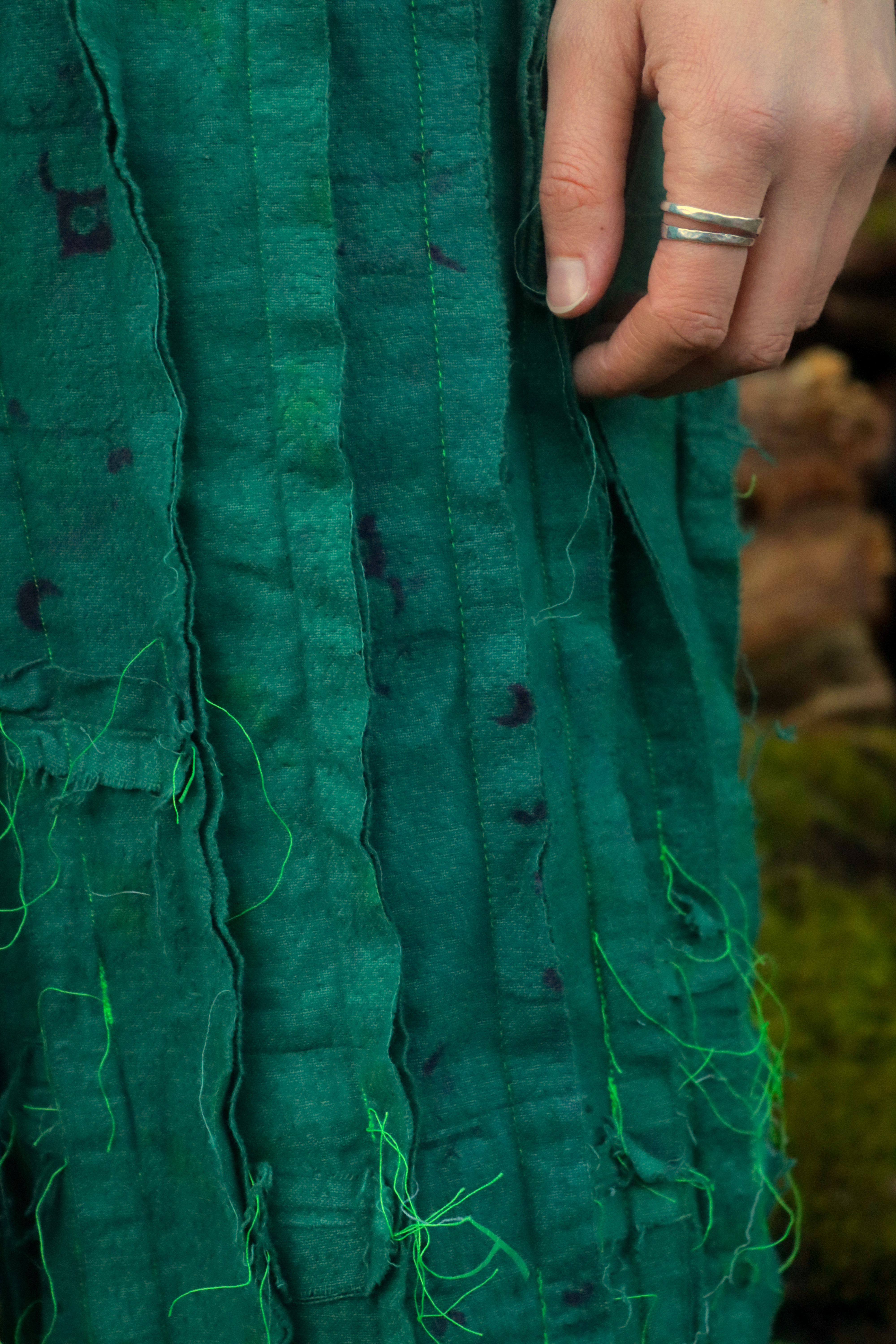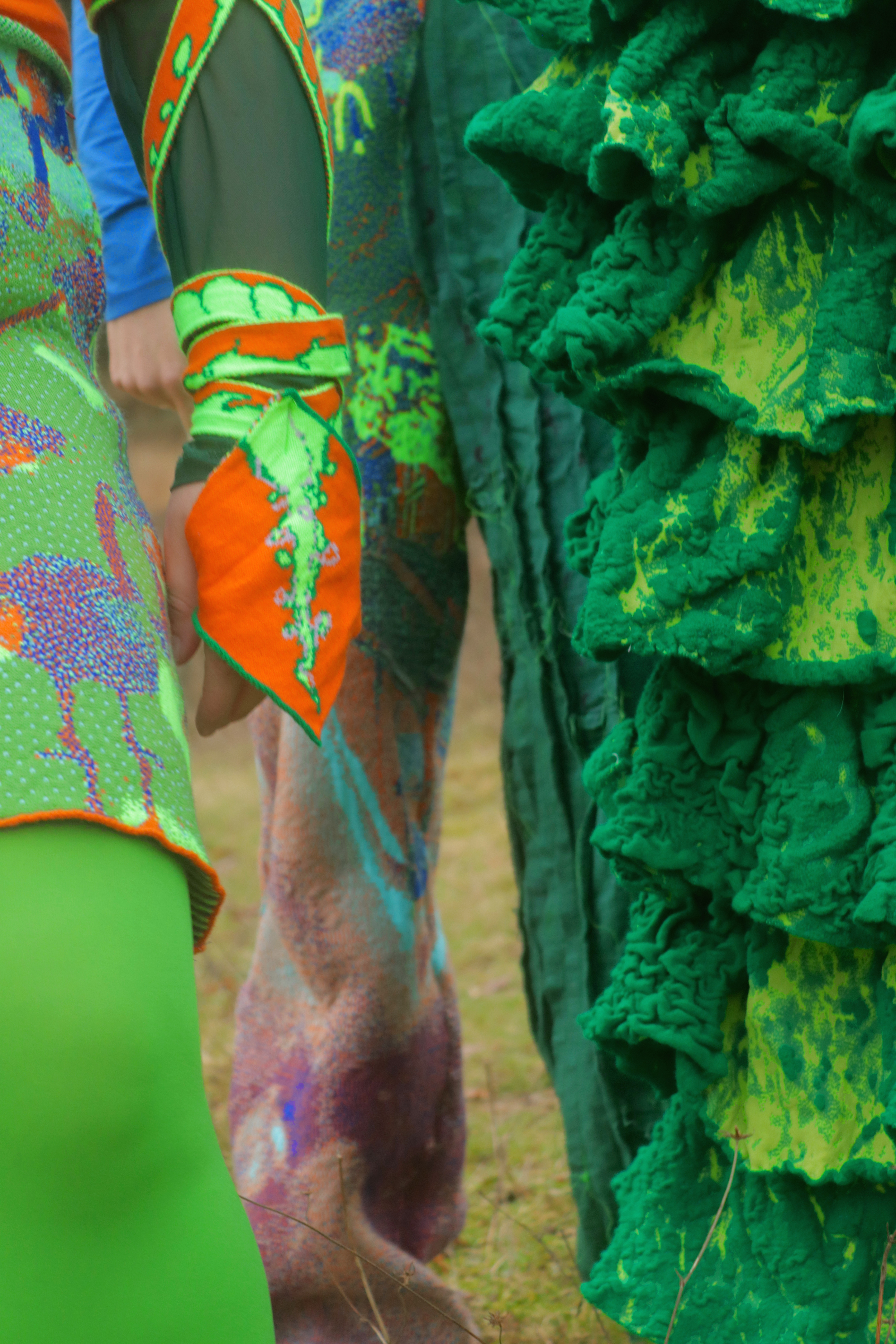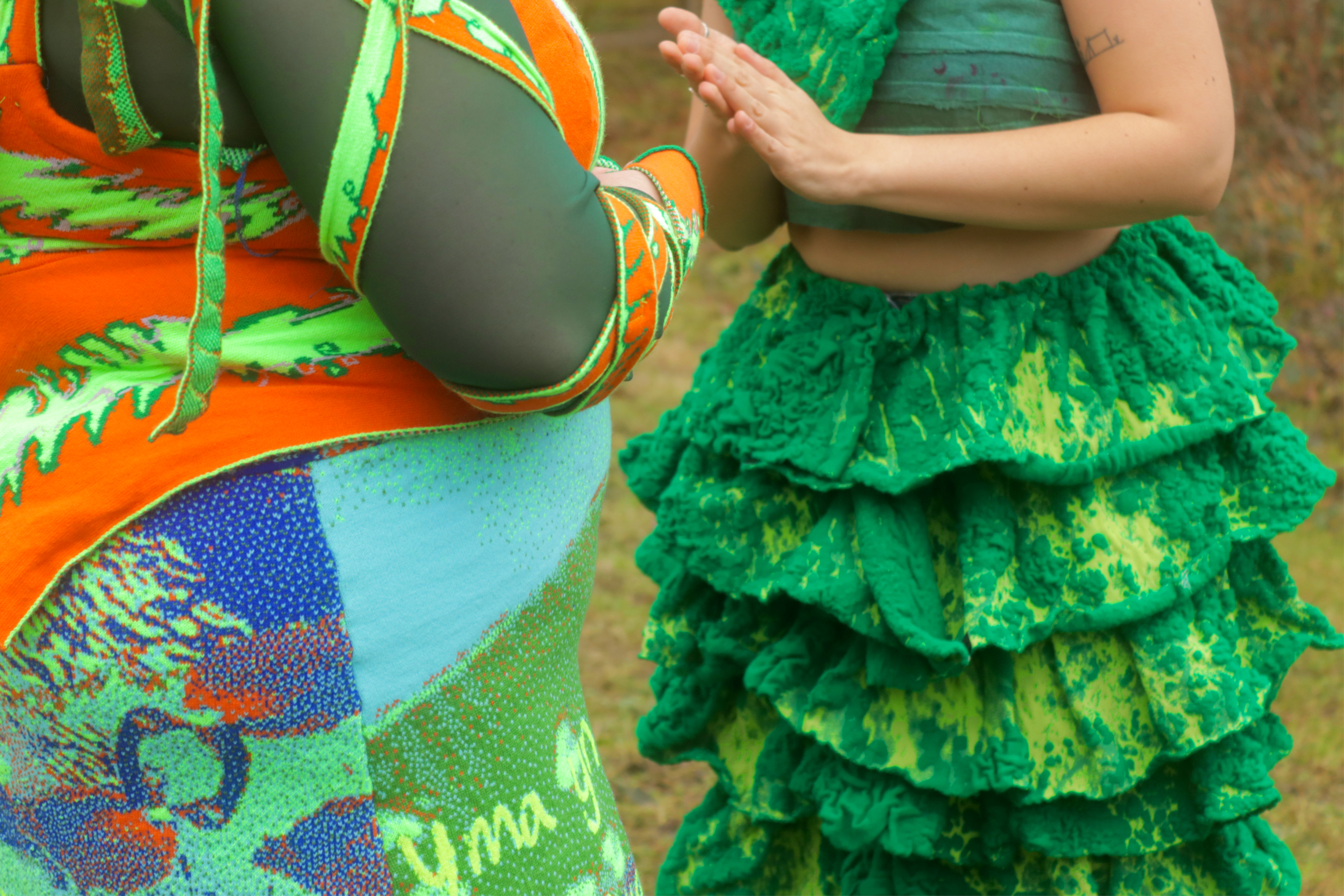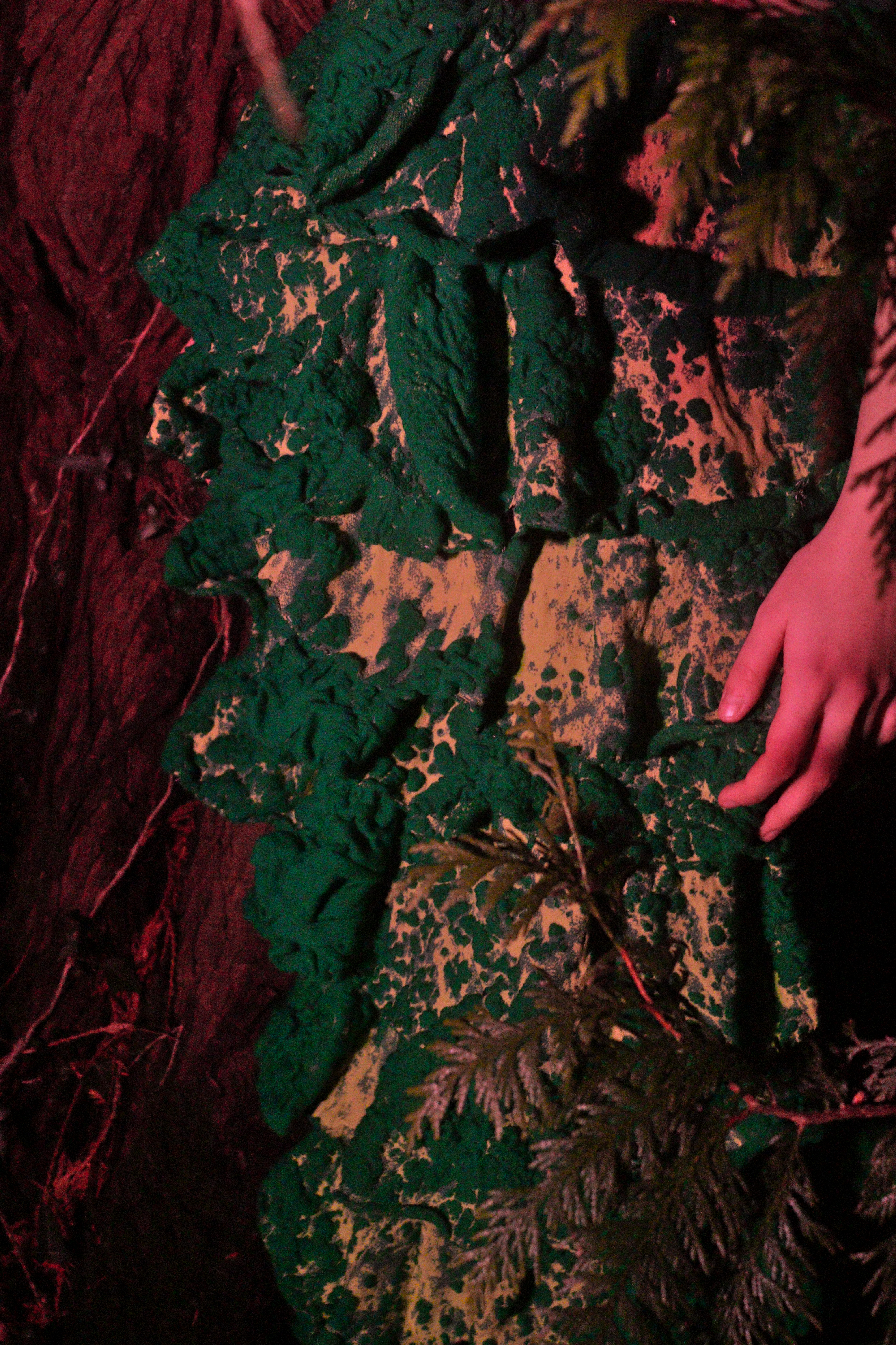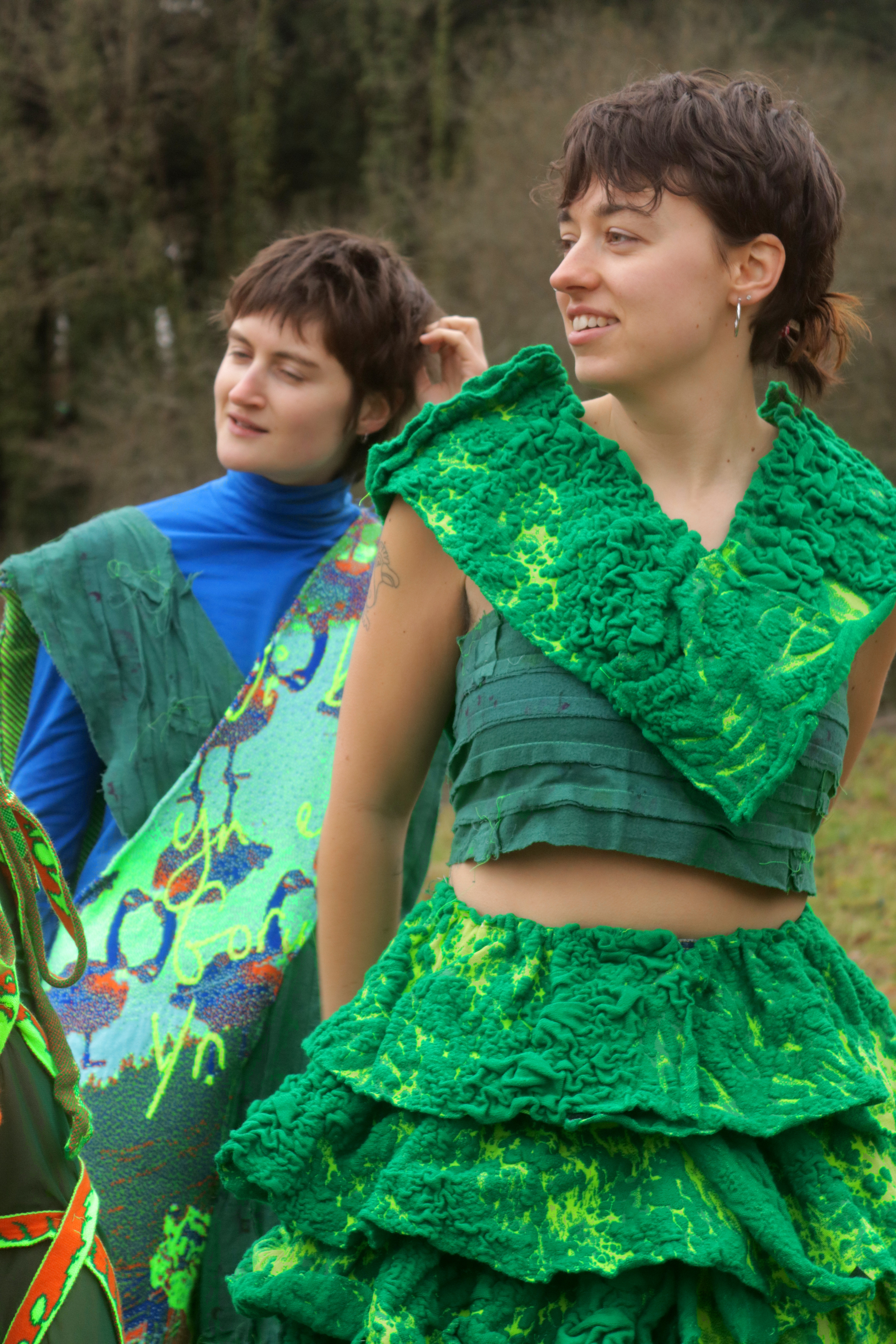 Adwaith’s Gwen wears a digitally knitted ensemble that takes its form from moss textures found within Welsh landscapes. The bra is formed from over dyed strips of cotton pyjamas sewn together conveying a longing ‘to be home.’ The silhouette is influenced by the traditional Welsh bedgown and various shawl wrapping methods women practiced as part of their traditional Welsh dress.