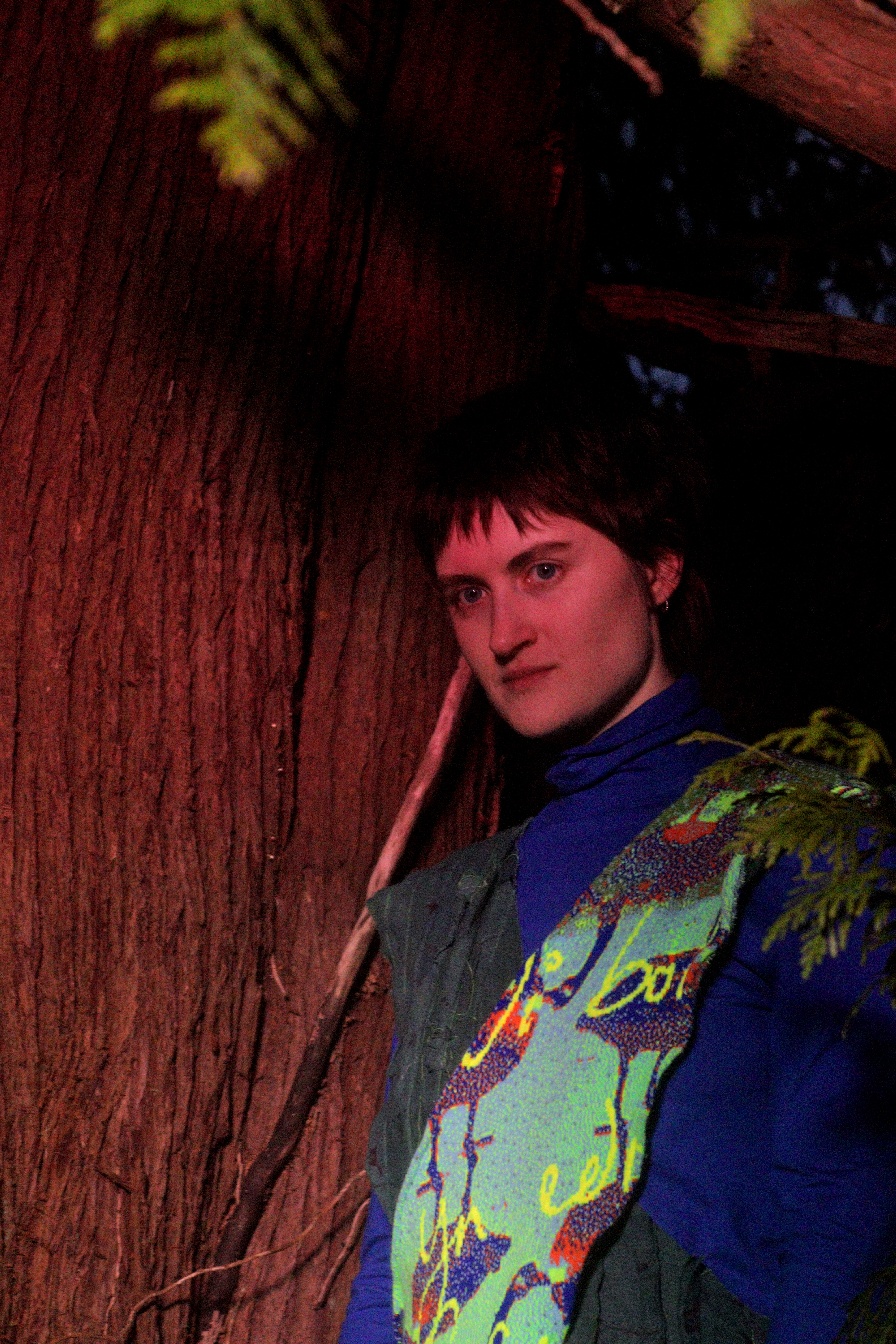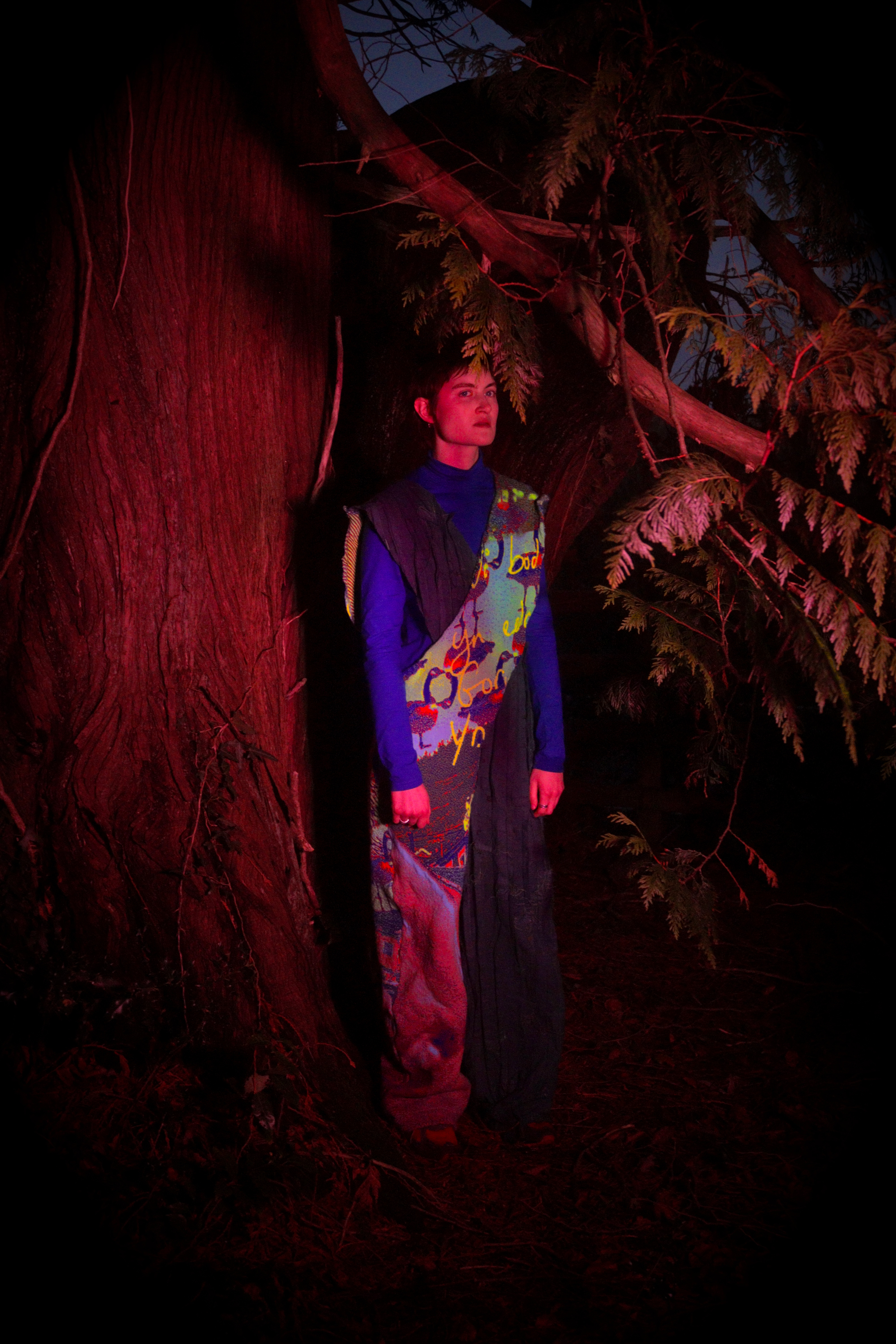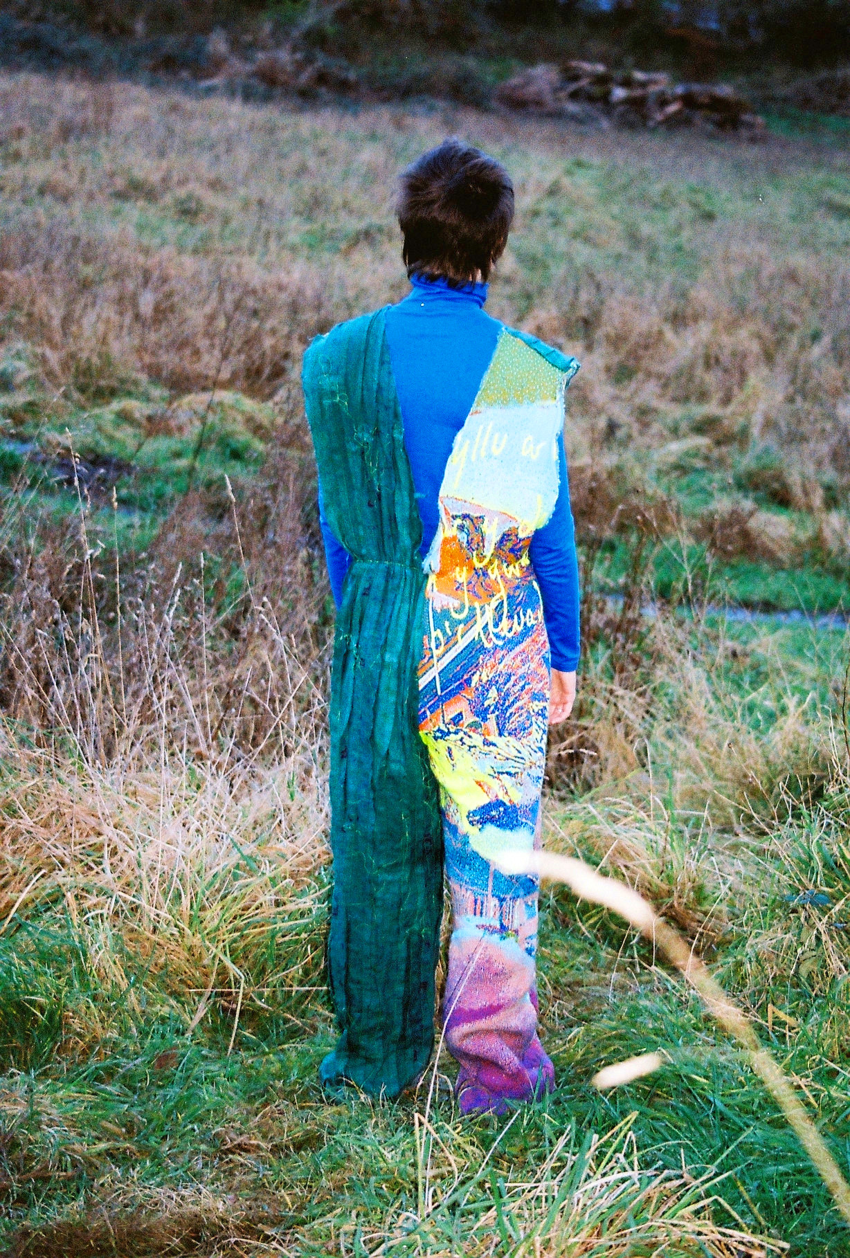 Adwaith’s Heledd Owen wears a crossover jumpsuit that takes its form from the various methods of shawl wrapping Welsh women practiced as part of their traditional dress. One half is formed from over dyed strips of cotton pyjamas sewn together conveying a longing ‘to be home.’ The other is formed from a digital knit comprised of Welsh landscape imagery and Welsh handwriting.